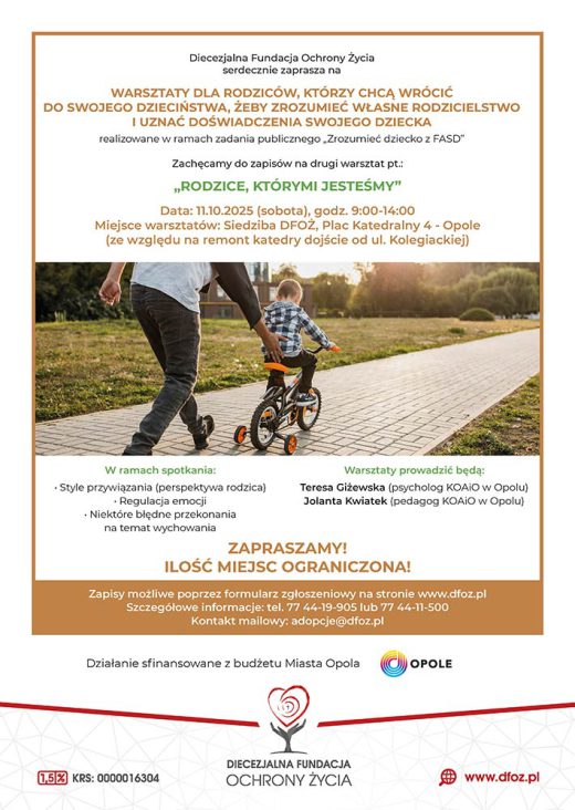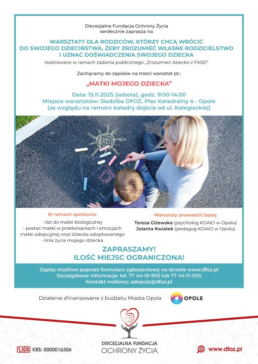 Serdecznie zapraszamy do rejestracji na pierwsze warsztaty dedykowane rodzicom, opiekunom, nauczycielom oraz osobom pracującym z dziećmi w ramach zadania publicznego „Zrozumieć dziecko z FASD” sfinansowanego ze środków budżetu Miasta Opola.