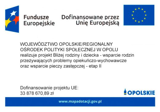 Projekt jest współfinansowany ze środków Europejskiego Funduszu Społecznego Plus w Ramach Funduszy Europejskich dla Opolskiego 2021-2027, Priorytet 6 Fundusze Europejskie wspierające włączenie społeczne w opolskim, działanie 6.7 Wsparcie rodziny i pieczy zastępczej.