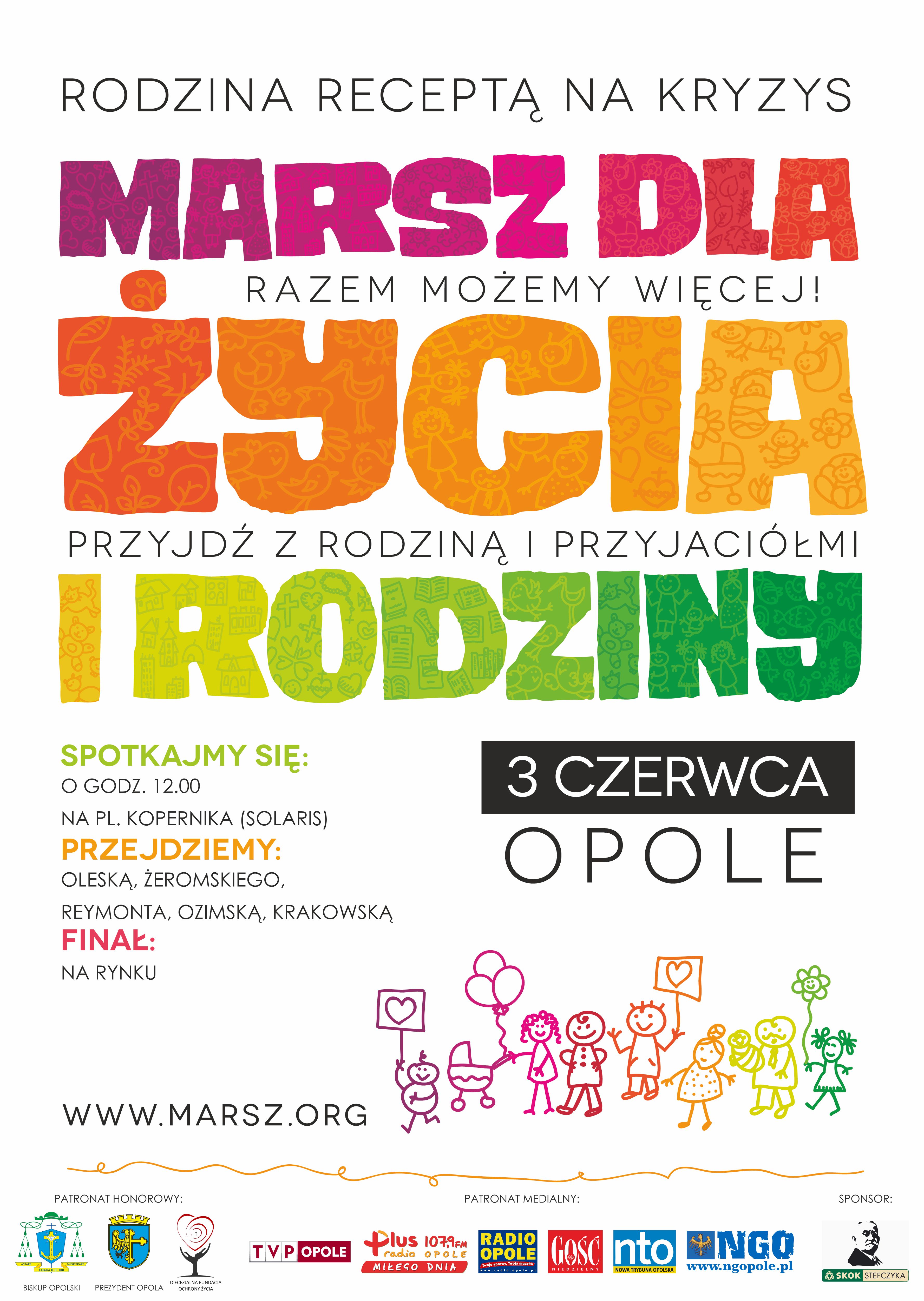 Już w niedzielę 3 czerwca ulicami trzech miast naszej diecezji: Opola, Raciborza i Kluczborka, pod hasłem „Rodzina receptą na kryzys” przejdą Marsze dla Życia i Rodziny. Wydarzenie to będzie manifestacją przywiązania do wartości rodzinnych i poszanowania życia każdej osoby, od momentu poczęcia aż do naturalnej śmierci. W tym roku marsze przejdą w łączności z VII Światowym Spotkaniem Rodzin z Ojcem Świętym w Mediolanie. Podobne marsze odbędą się jednocześnie w ponad 40 miastach w Polsce. Do udziału w tych wydarzeniach zaproszone są nie tylko rodziny z dziećmi, ale także organizacje pozarządowe, osoby publiczne, wszelkiego rodzaju wspólnoty i grupy oraz wszyscy, którym bliskie są wartości życia ludzkiego i tradycyjnej rodziny. Honorowy patronat nad wydarzeniem objął Biskup Opolski Andrzej Czaja.